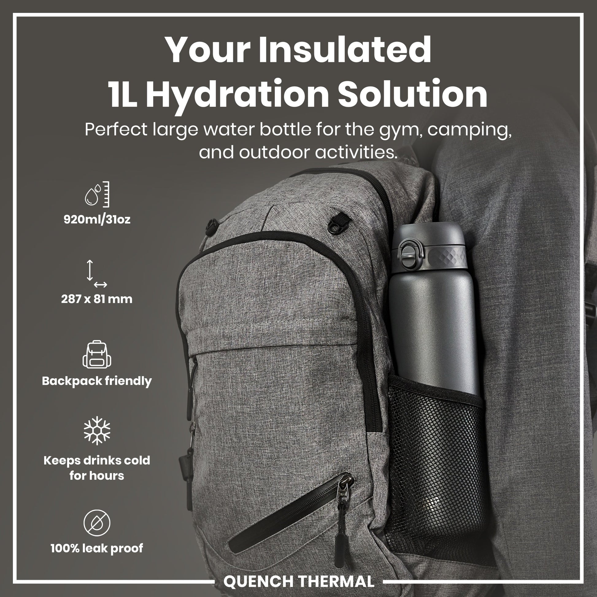 100% leak proof almost 1 litre (920ml / 30oz) vacuum insulated double wall stainless steel grey water bottle with a smooth flow for spill-free hydration and hygienic full-flip top cover for one handed use on-the-go. Keeps hot drinks hot and cold drinks icy cold and fresh for hours.