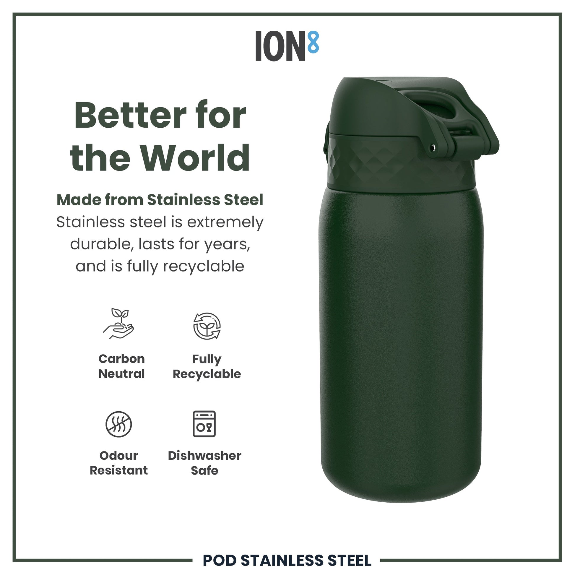 Made from lightweight stainless steel. Stainless steel is extremely durable, lasts for years, and is fully recyclable. This refillable and reusable drinks bottle is food safe, odour resistant, easy to hand wash, and keeps drinks fresh and full of flavour. With a raised 3D tactile feel print.