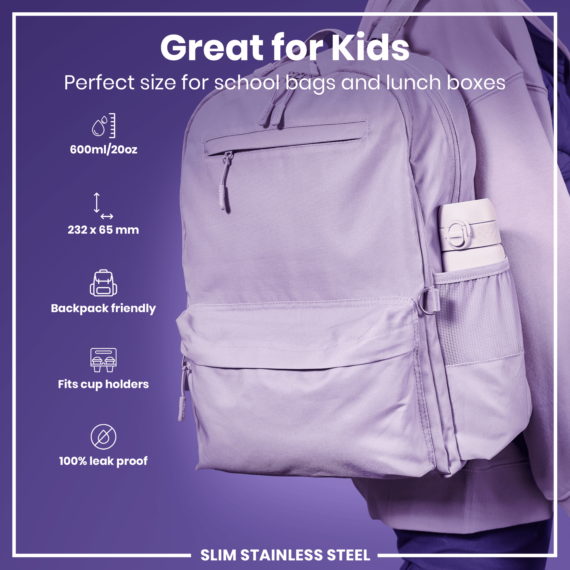 Leak Proof Slim Water Bottle, Stainless Steel, Lilac Dusk, 600ml (20oz)