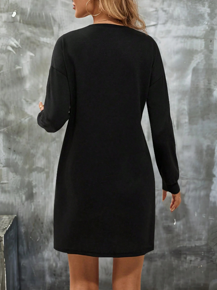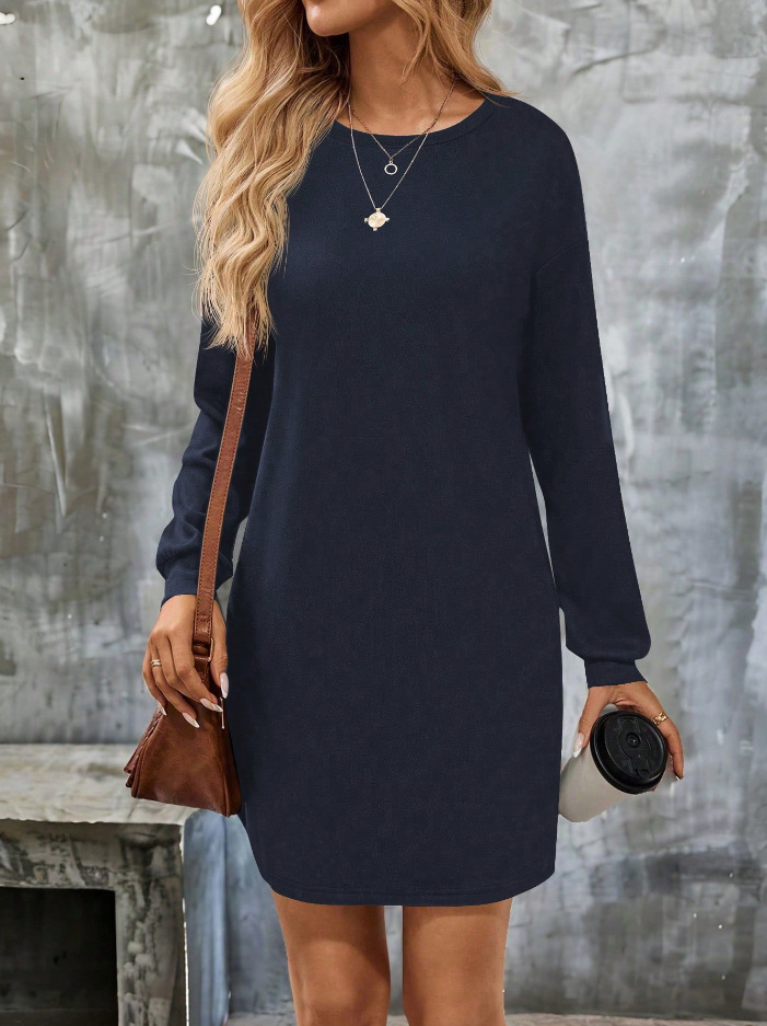 Women's Long-Sleeve Round-Neck Knitted Solid-Color Dress