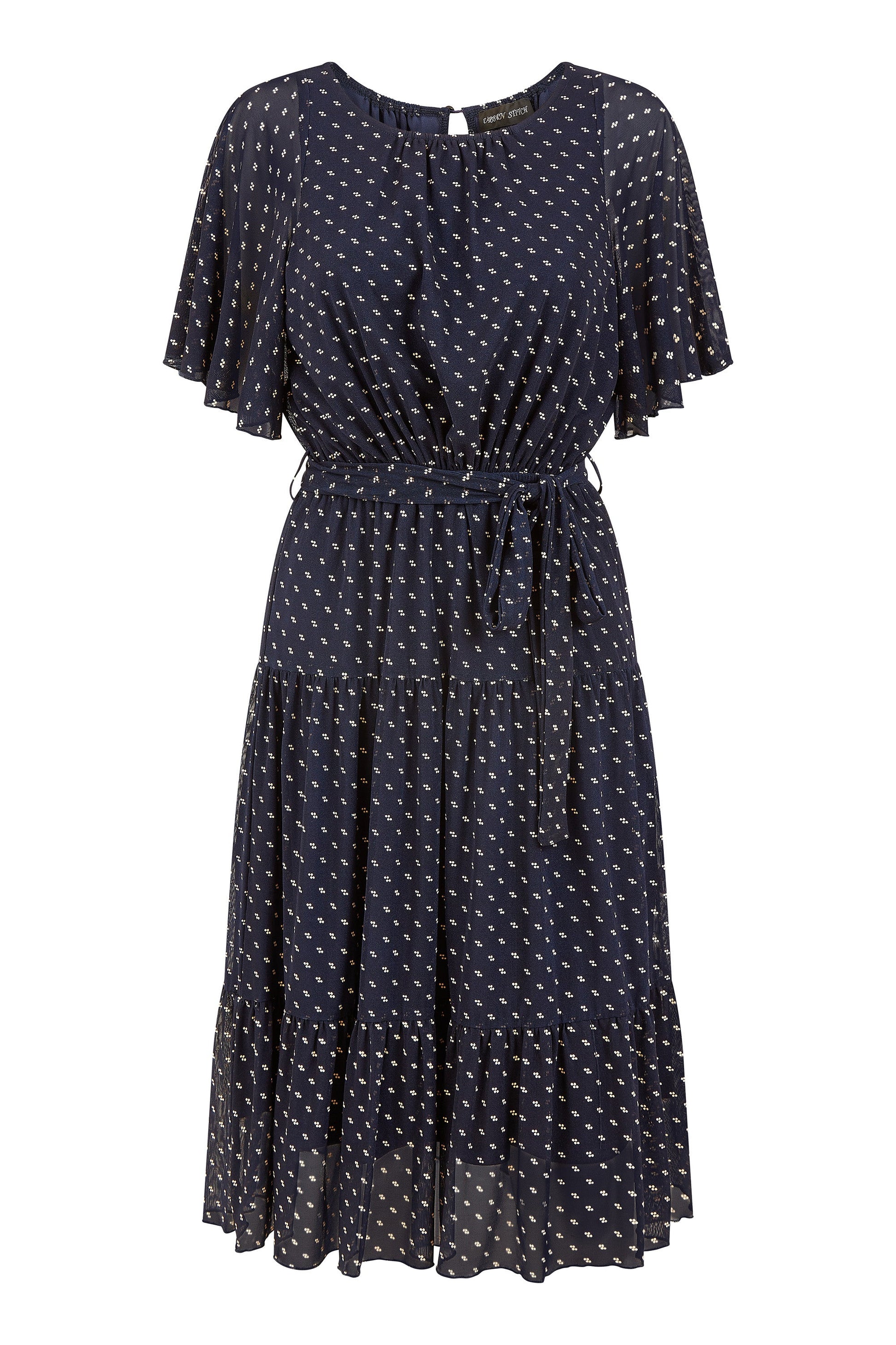 Prim and proper never looked so good! This versatile skater dress in an all over dot print on fine mesh is flowy and feminine. The angel sleeves add to the ethereal silhouette, with a self tie waist belt and midi length. Style this piece with heels for occasions, or boots and tights for a more casual vibe.