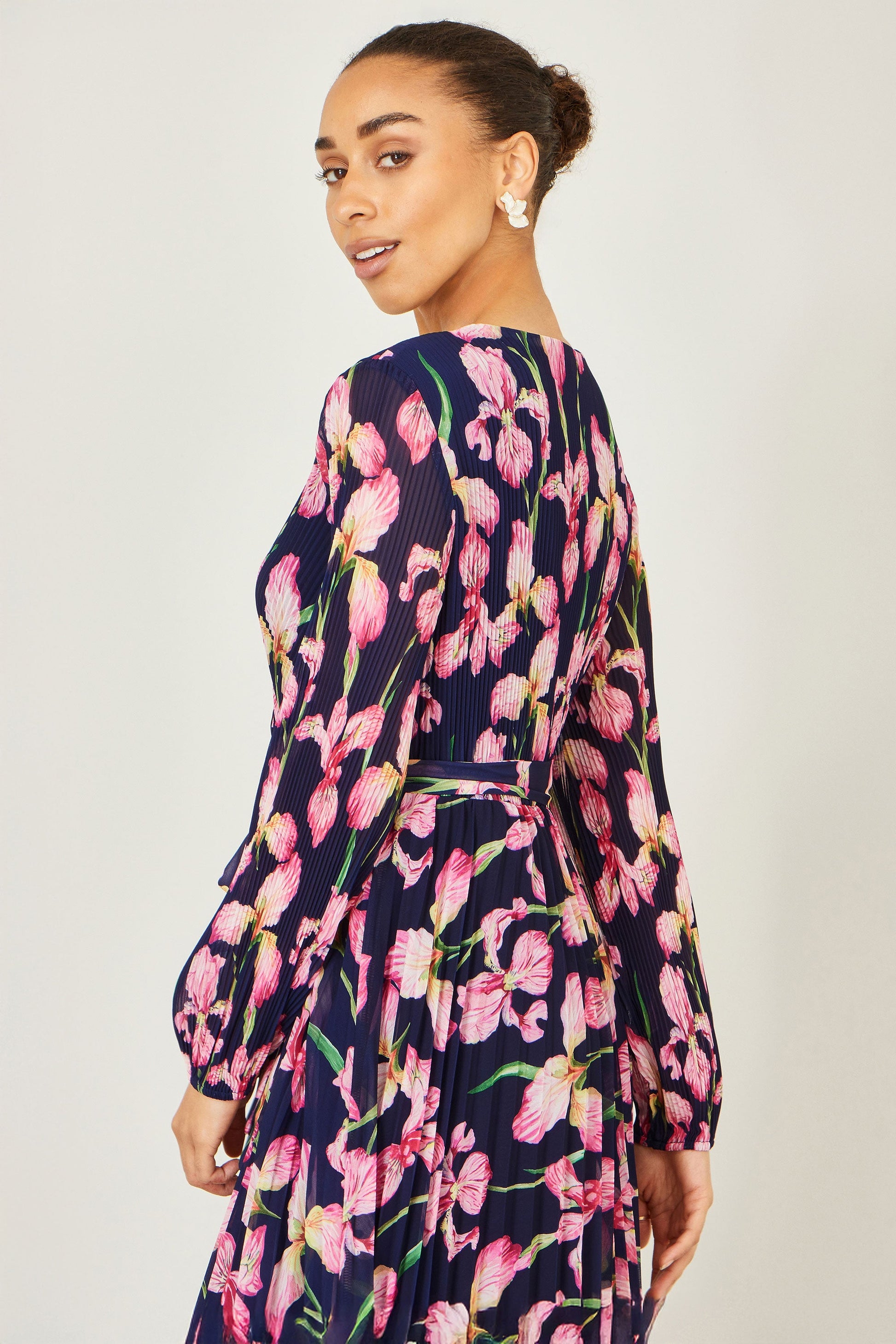Yumi Navy Orchid Floral Pleated Wrap Maxi Dress